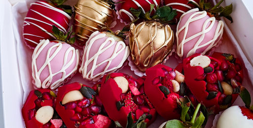 This delightful Strawberry Treat Box features a delicious assortment of fresh strawberries, each carefully covered in premium chocolate. The strawberries are elegantly decorated in three beautiful color combinations: red and white, pink and white, and gold. Each color set includes four strawberries, offering a stunning variety. Alongside the strawberries, you'll find five indulgent fruit and nut chocolate hearts, adding an extra layer of sweetness and crunch to this luxurious treat box. Perfect for any special occasion or as a thoughtful gift!